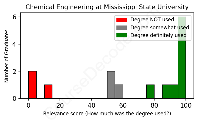 The verdict? Slightly above average. Overall, with an average relevance score of 68%, Chemical Engineering graduates from Mississippi State University have a slightly higher likelihood (+1%) of finding work in this field compared to the average graduate across all fields: