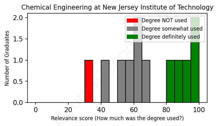 The verdict? Slightly above average. Overall, with an average relevance score of 69%, Chemical Engineering graduates from New Jersey Institute of Technology have a slightly higher likelihood (+2%) of finding work in this field compared to the average graduate across all fields: