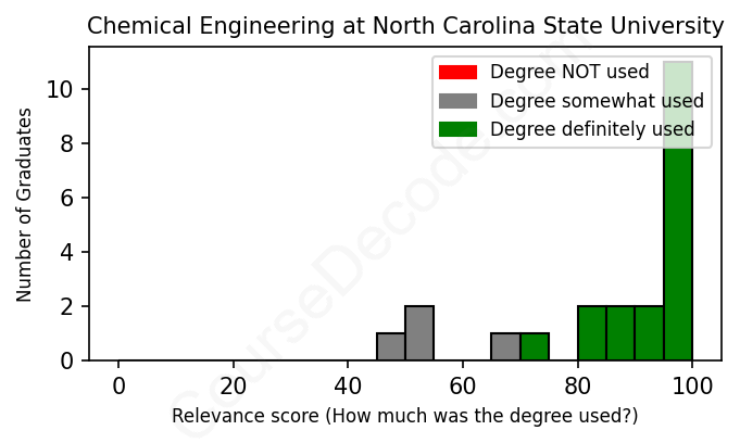 The verdict? Significantly above average. Overall, with an average relevance score of 86%, Chemical Engineering graduates from North Carolina State University have a much higher likelihood (+19%) of finding work in this field compared to the average graduate across all fields: