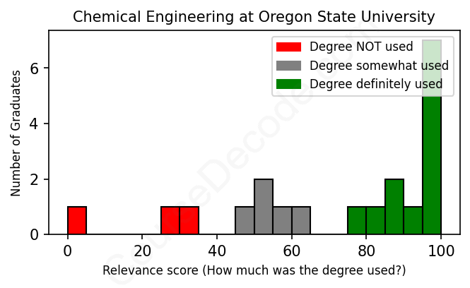 The verdict? Slightly above average. Overall, with an average relevance score of 72%, Chemical Engineering graduates from Oregon State University have a slightly higher likelihood (+5%) of finding work in this field compared to the average graduate across all fields: