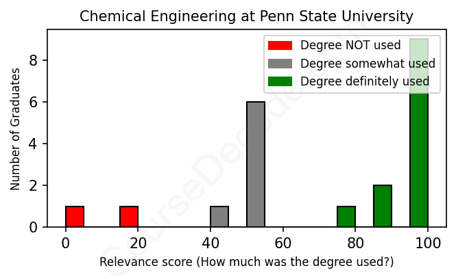 The verdict? Slightly above average. Overall, with an average relevance score of 71%, Chemical Engineering graduates from Penn State University have a slightly higher likelihood (+4%) of finding work in this field compared to the average graduate across all fields: