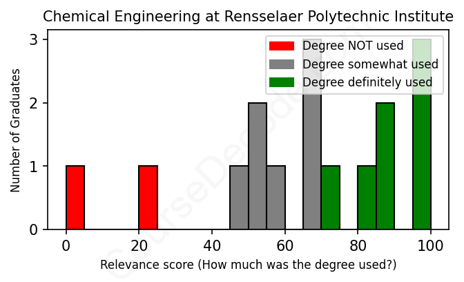The verdict? Slightly below average. Overall, with an average relevance score of 65%, Chemical Engineering graduates from Rensselaer Polytechnic Institute have a slightly lower likelihood (-2%) of finding work in this field compared to the average graduate across all fields:
