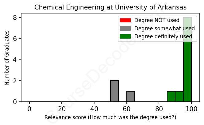 The verdict? Significantly above average. Overall, with an average relevance score of 87%, Chemical Engineering graduates from University of Arkansas have a much higher likelihood (+20%) of finding work in this field compared to the average graduate across all fields: