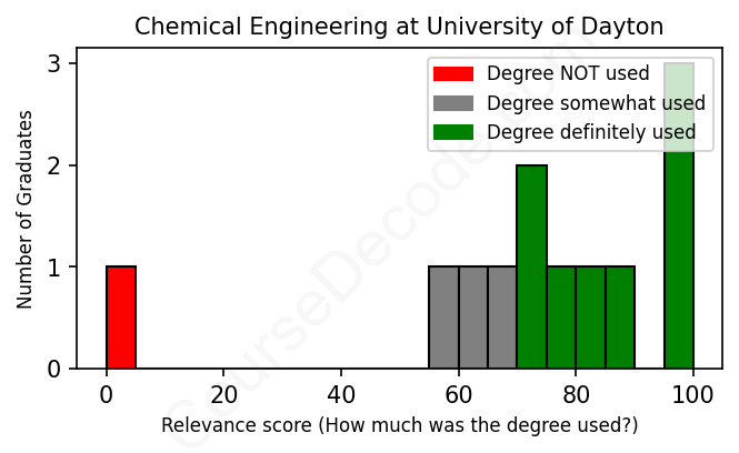 The verdict? Slightly above average. Overall, with an average relevance score of 72%, Chemical Engineering graduates from University of Dayton have a slightly higher likelihood (+5%) of finding work in this field compared to the average graduate across all fields: