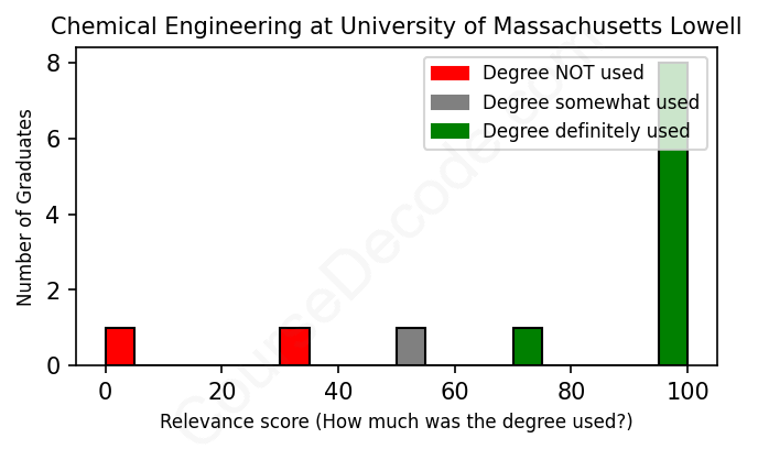 The verdict? Significantly above average. Overall, with an average relevance score of 79%, Chemical Engineering graduates from University of Massachusetts Lowell have a much higher likelihood (+12%) of finding work in this field compared to the average graduate across all fields:
