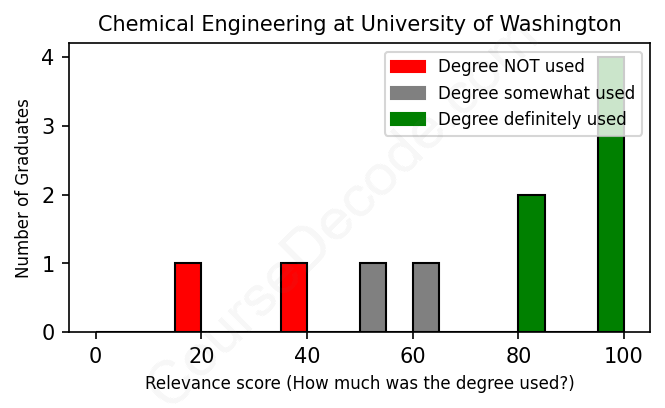 The verdict? Slightly above average. Overall, with an average relevance score of 71%, Chemical Engineering graduates from University of Washington have a slightly higher likelihood (+4%) of finding work in this field compared to the average graduate across all fields: