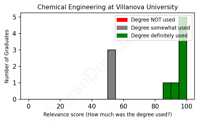 The verdict? Significantly above average. Overall, with an average relevance score of 82%, Chemical Engineering graduates from Villanova University have a much higher likelihood (+15%) of finding work in this field compared to the average graduate across all fields: