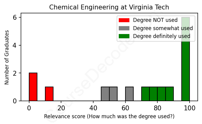 The verdict? Slightly above average. Overall, with an average relevance score of 68%, Chemical Engineering graduates from Virginia Tech have a slightly higher likelihood (+1%) of finding work in this field compared to the average graduate across all fields: