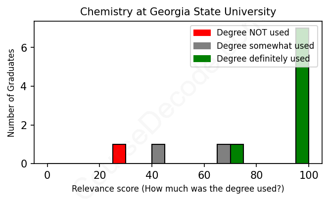 The verdict? Significantly above average. Overall, with an average relevance score of 82%, Chemistry graduates from Georgia State University have a much higher likelihood (+15%) of finding work in this field compared to the average graduate across all fields: