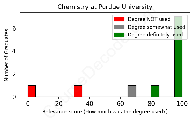 The verdict? Significantly above average. Overall, with an average relevance score of 80%, Chemistry graduates from Purdue University have a much higher likelihood (+13%) of finding work in this field compared to the average graduate across all fields: