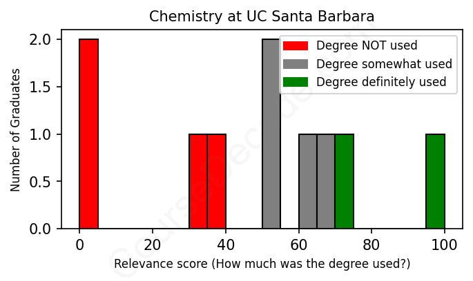 The verdict? Bad. Overall, with an average relevance score of 46%, Chemistry graduates from UC Santa Barbara have a substantially lower likelihood (-21%) of finding work in this field compared to the average graduate across all fields: