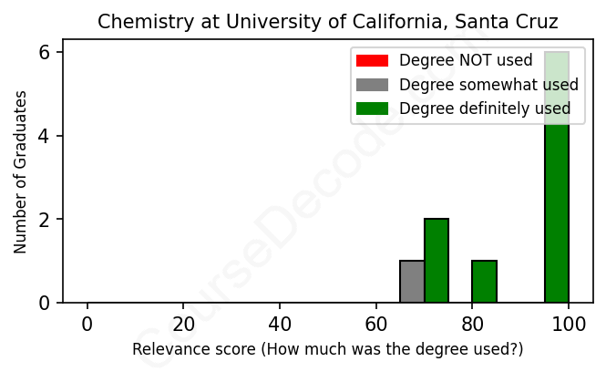 The verdict? Great! Overall, with an average relevance score of 88%, Chemistry graduates from University of California, Santa Cruz have a substantially higher likelihood (+21%) of finding work in this field compared to the average graduate across all fields: