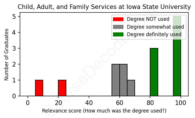 The verdict? Above average. Overall, with an average relevance score of 75%, Child, Adult, and Family Services graduates from Iowa State University have a higher likelihood (+8%) of finding work in this field compared to the average graduate across all fields: