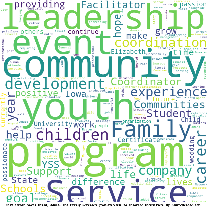 Here is a visual representation of the most common words seen in the "about" section of LinkedIn profiles who have a Bachelor degree in Child, Adult, and Family Services (this is across all Child, Adult, and Family Services graduates we've analyzed, not just those who went to Iowa State University). This may or may not be useful: