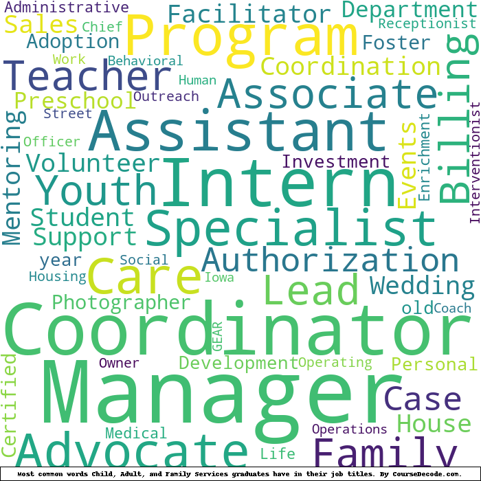 Here is a visual representation of the most common words in job titles for Child, Adult, and Family Services graduates (this is across all Child, Adult, and Family Services graduates we've analyzed, not just those who went to Iowa State University):