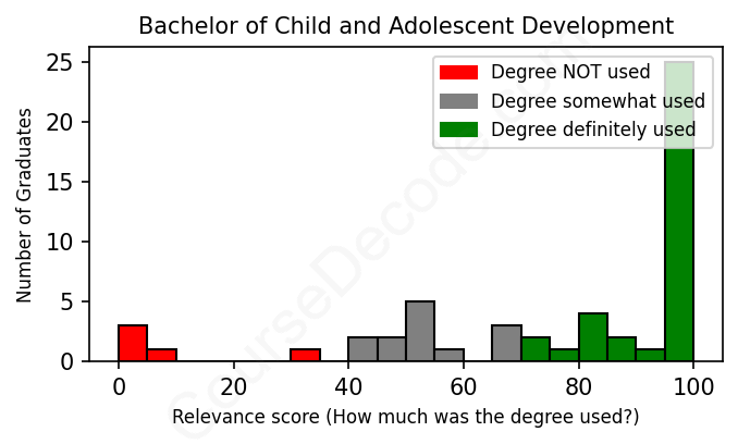 The verdict? Above average. Overall, with an average relevance score of 76%, Child and Adolescent Development graduates have a higher likelihood (+9%) of finding work in this field compared to the average graduate across all fields: