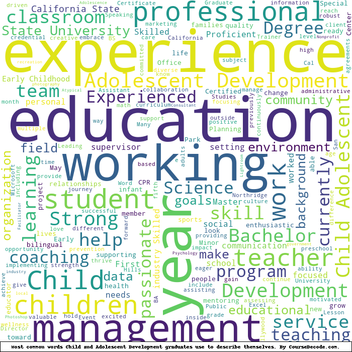 Here is a visual representation of the most common words seen in the "about" section of LinkedIn profiles who have a Bachelor degree in Child and Adolescent Development. This may or may not be useful: