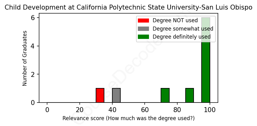 First, some facts. Of the Child Development graduates from California Polytechnic State University-San Luis Obispo we've analyzed , here's how many have used (or NOT used) their degree in their career: