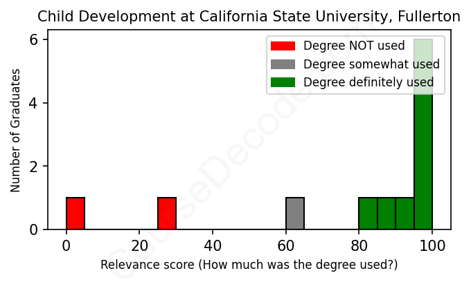 The verdict? Significantly above average. Overall, with an average relevance score of 79%, Child Development graduates from California State University, Fullerton have a much higher likelihood (+12%) of finding work in this field compared to the average graduate across all fields: