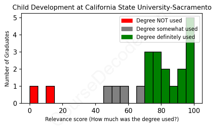 The verdict? Above average. Overall, with an average relevance score of 73%, Child Development graduates from California State University-Sacramento have a higher likelihood (+6%) of finding work in this field compared to the average graduate across all fields: