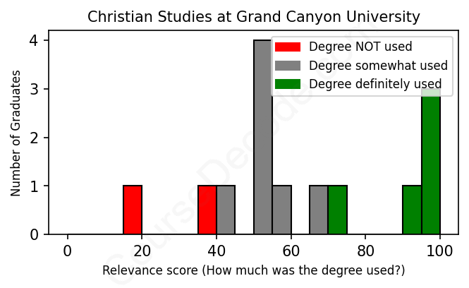 The verdict? Slightly below average. Overall, with an average relevance score of 63%, Christian Studies graduates from Grand Canyon University have a slightly lower likelihood (-4%) of finding work in this field compared to the average graduate across all fields: