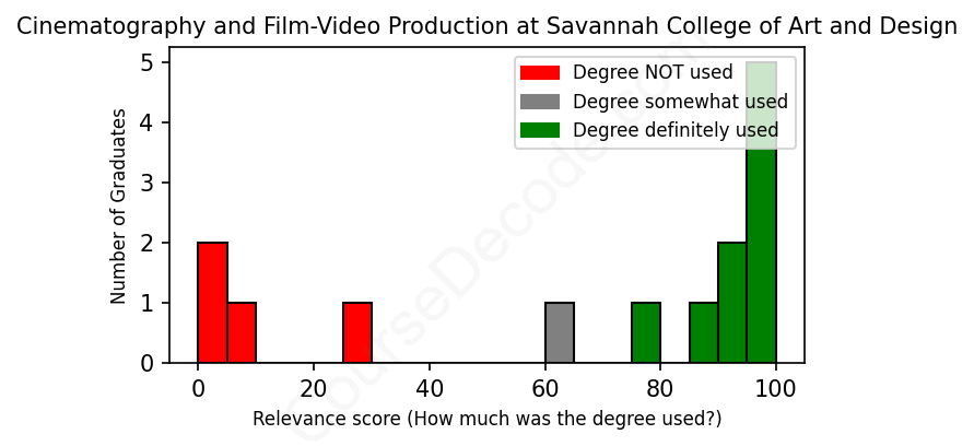 First, some facts. Of the Cinematography and Film-Video Production graduates from Savannah College of Art and Design we've analyzed , here's how many have used (or NOT used) their degree in their career: