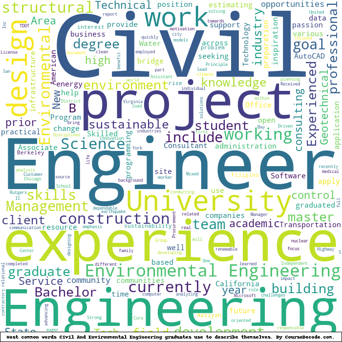 Here is a visual representation of the most common words seen in the "about" section of LinkedIn profiles who have a Bachelor degree in Civil And Environmental Engineering. This may or may not be useful: