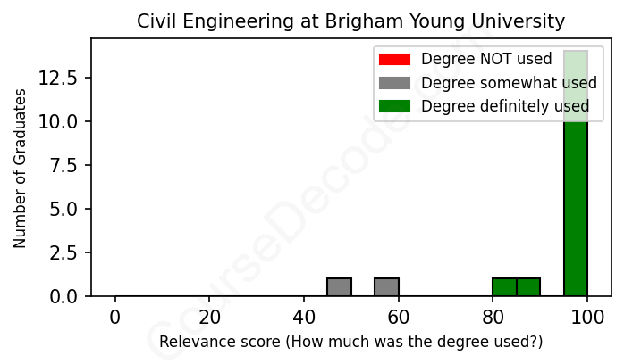 The verdict? Great! Overall, with an average relevance score of 92%, Civil Engineering graduates from Brigham Young University have a substantially higher likelihood (+25%) of finding work in this field compared to the average graduate across all fields: