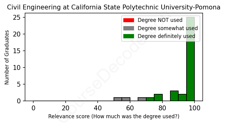 The verdict? Great! Overall, with an average relevance score of 92%, Civil Engineering graduates from California State Polytechnic University-Pomona have a substantially higher likelihood (+25%) of finding work in this field compared to the average graduate across all fields: