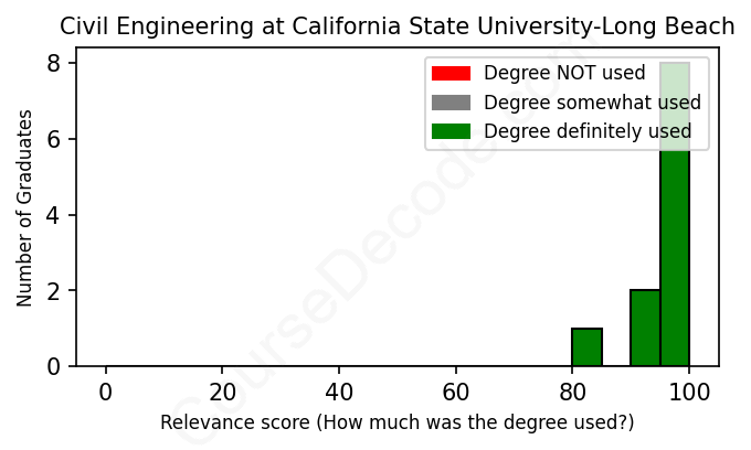 The verdict? Great! Overall, with an average relevance score of 97%, Civil Engineering graduates from California State University-Long Beach have a substantially higher likelihood (+30%) of finding work in this field compared to the average graduate across all fields:
