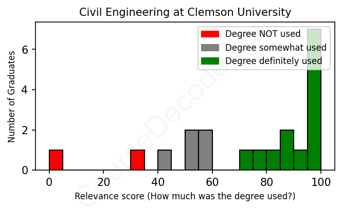 The verdict? Above average. Overall, with an average relevance score of 74%, Civil Engineering graduates from Clemson University have a higher likelihood (+7%) of finding work in this field compared to the average graduate across all fields: