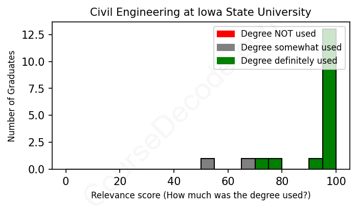 The verdict? Great! Overall, with an average relevance score of 92%, Civil Engineering graduates from Iowa State University have a substantially higher likelihood (+25%) of finding work in this field compared to the average graduate across all fields: