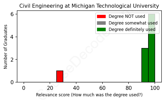 The verdict? Great! Overall, with an average relevance score of 90%, Civil Engineering graduates from Michigan Technological University have a substantially higher likelihood (+23%) of finding work in this field compared to the average graduate across all fields: