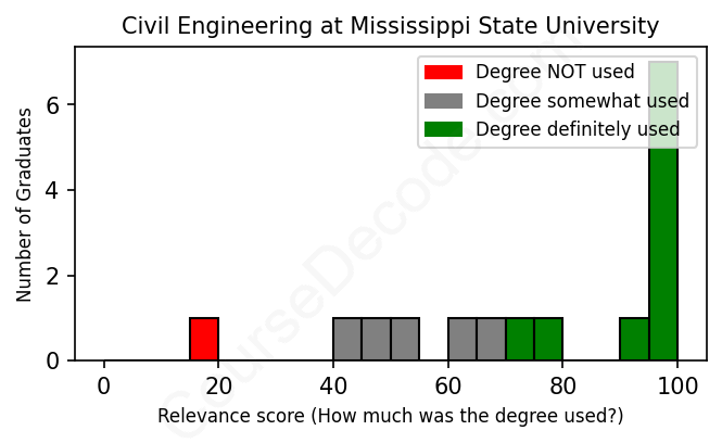 The verdict? Above average. Overall, with an average relevance score of 76%, Civil Engineering graduates from Mississippi State University have a higher likelihood (+9%) of finding work in this field compared to the average graduate across all fields: