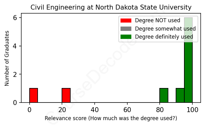 The verdict? Significantly above average. Overall, with an average relevance score of 79%, Civil Engineering graduates from North Dakota State University have a much higher likelihood (+12%) of finding work in this field compared to the average graduate across all fields: