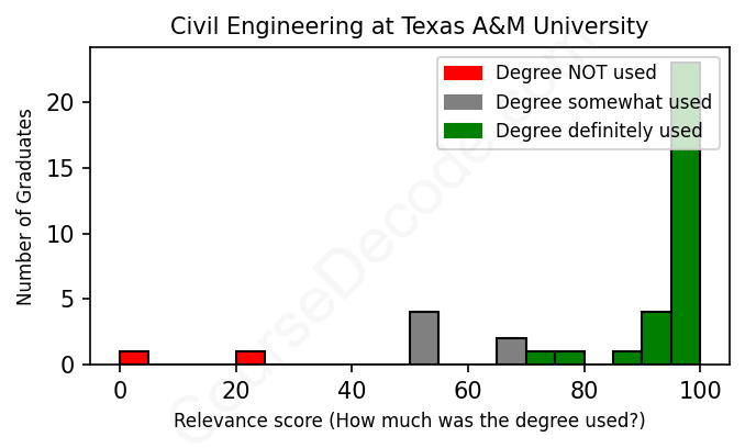 The verdict? Significantly above average. Overall, with an average relevance score of 85%, Civil Engineering graduates from Texas A&M University have a much higher likelihood (+18%) of finding work in this field compared to the average graduate across all fields: