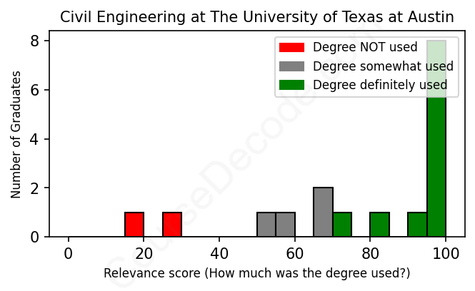 The verdict? Above average. Overall, with an average relevance score of 77%, Civil Engineering graduates from The University of Texas at Austin have a higher likelihood (+10%) of finding work in this field compared to the average graduate across all fields: