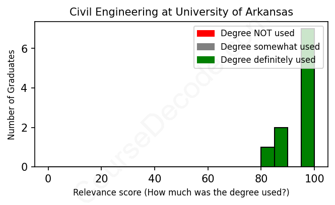 The verdict? Great! Overall, with an average relevance score of 95%, Civil Engineering graduates from University of Arkansas have a substantially higher likelihood (+28%) of finding work in this field compared to the average graduate across all fields: