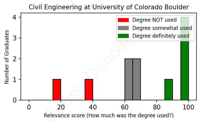 The verdict? Slightly above average. Overall, with an average relevance score of 72%, Civil Engineering graduates from University of Colorado Boulder have a slightly higher likelihood (+5%) of finding work in this field compared to the average graduate across all fields: