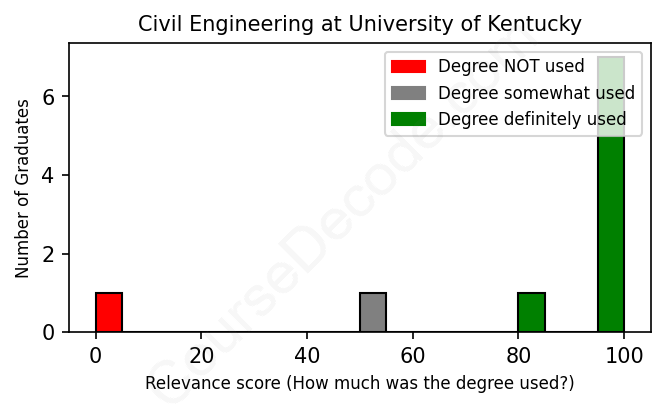 The verdict? Significantly above average. Overall, with an average relevance score of 83%, Civil Engineering graduates from University of Kentucky have a much higher likelihood (+16%) of finding work in this field compared to the average graduate across all fields: