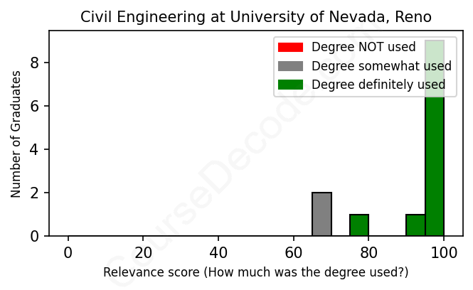 The verdict? Great! Overall, with an average relevance score of 92%, Civil Engineering graduates from University of Nevada, Reno have a substantially higher likelihood (+25%) of finding work in this field compared to the average graduate across all fields: