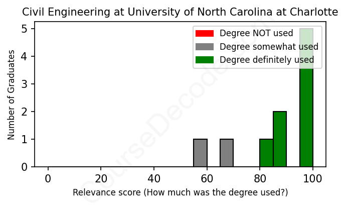 The verdict? Significantly above average. Overall, with an average relevance score of 87%, Civil Engineering graduates from University of North Carolina at Charlotte have a much higher likelihood (+20%) of finding work in this field compared to the average graduate across all fields:
