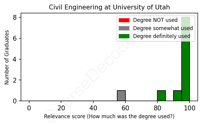 The verdict? Great! Overall, with an average relevance score of 93%, Civil Engineering graduates from University of Utah have a substantially higher likelihood (+26%) of finding work in this field compared to the average graduate across all fields: