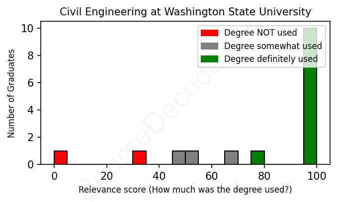 The verdict? Significantly above average. Overall, with an average relevance score of 79%, Civil Engineering graduates from Washington State University have a much higher likelihood (+12%) of finding work in this field compared to the average graduate across all fields: