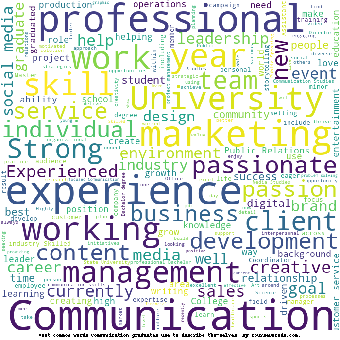 Here is a visual representation of the most common words seen in the "about" section of LinkedIn profiles who have a Bachelor degree in Communication. This may or may not be useful: