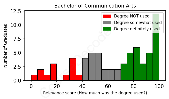 The verdict? Slightly below average. Overall, with an average relevance score of 64%, Communication Arts graduates have a slightly lower likelihood (-3%) of finding work in this field compared to the average graduate across all fields: