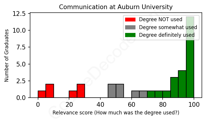 The verdict? Slightly above average. Overall, with an average relevance score of 72%, Communication graduates from Auburn University have a slightly higher likelihood (+5%) of finding work in this field compared to the average graduate across all fields: