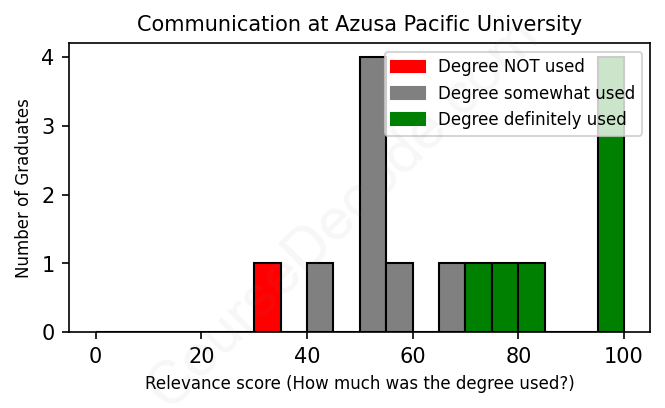 The verdict? Slightly above average. Overall, with an average relevance score of 68%, Communication graduates from Azusa Pacific University have a slightly higher likelihood (+1%) of finding work in this field compared to the average graduate across all fields: