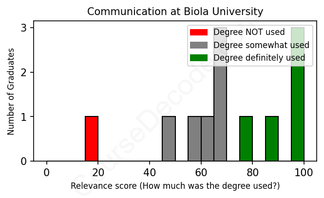 The verdict? Slightly above average. Overall, with an average relevance score of 70%, Communication graduates from Biola University have a slightly higher likelihood (+3%) of finding work in this field compared to the average graduate across all fields: