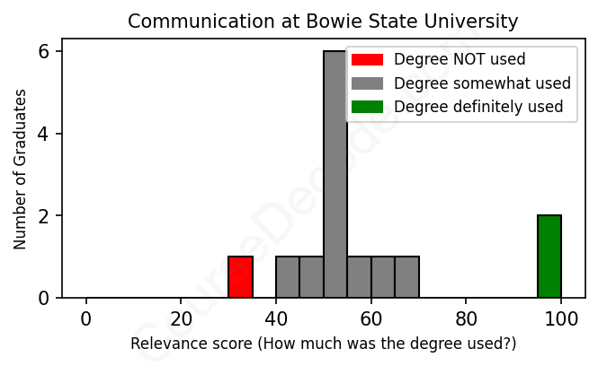 The verdict? Below average. Overall, with an average relevance score of 57%, Communication graduates from Bowie State University have a lower likelihood (-10%) of finding work in this field compared to the average graduate across all fields: